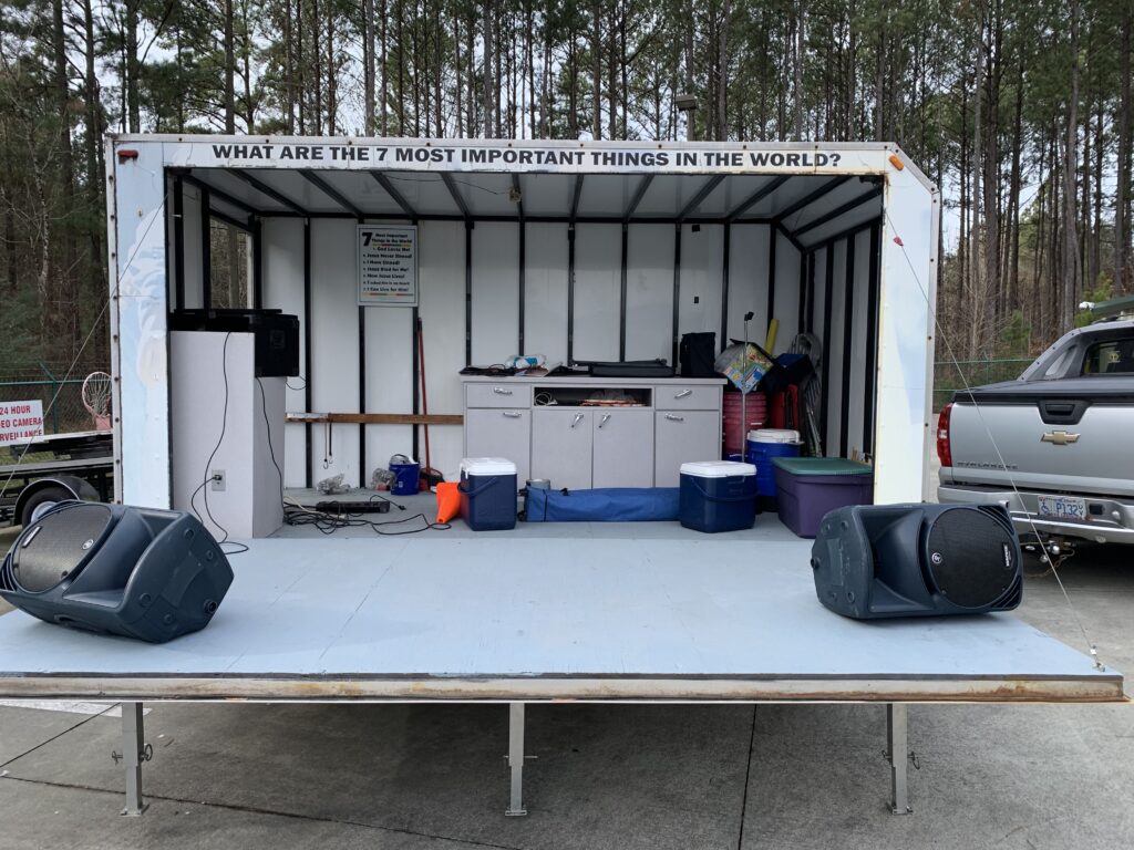 We have a project to buy a trailer with a stage and sound system. It will be used to bring the Gospel to the inner-city and do outdoor outreaches. RFM will park the trailer and fold down the side making a stage to give the Gospel (see example picture). Let us know if you are able to give to this project. The BGMC (Boys and Girls Missionary Challenge are Helping). People have started giving extra already, praise God (Florida, NC, VA) . When Kevin was in NYC and SC he had the opportunity to do ministry from a stage like this.